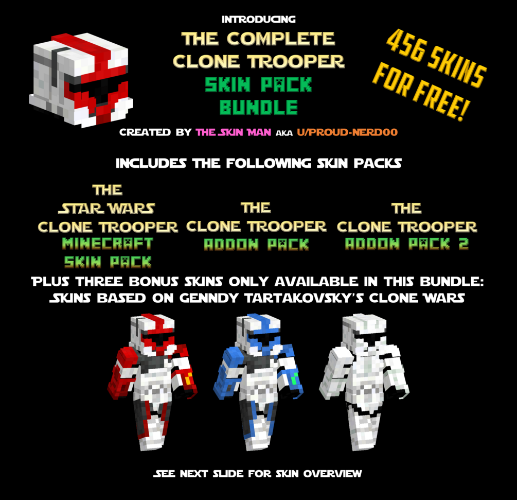 It's here! All of my clone trooper minecraft skins in one place. That's 295 from the original pack, 122 from the first addon pack, and 36 from the second, making 456 skins in total!